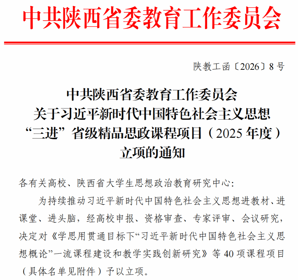 1月14日,中共陕西省委教育工作委员会公布了习近平新时代中国特色社会主义思想“三进”省级精品思政课程项目立项名单。我校马克思主义学院焦雯团队牵头申报的《数智时代高职“思想道德与法治”课程场景化教学模式改革研究》项目成功立项省级精品思政课程重点项目,全省共立项重点项目10项、一般项目30项,我校是入围重点项目立项的两所高职院校之一。这标志着我校在落实立德树人根本任务、深化高校思政课改革创新方面迈出了坚实一步。