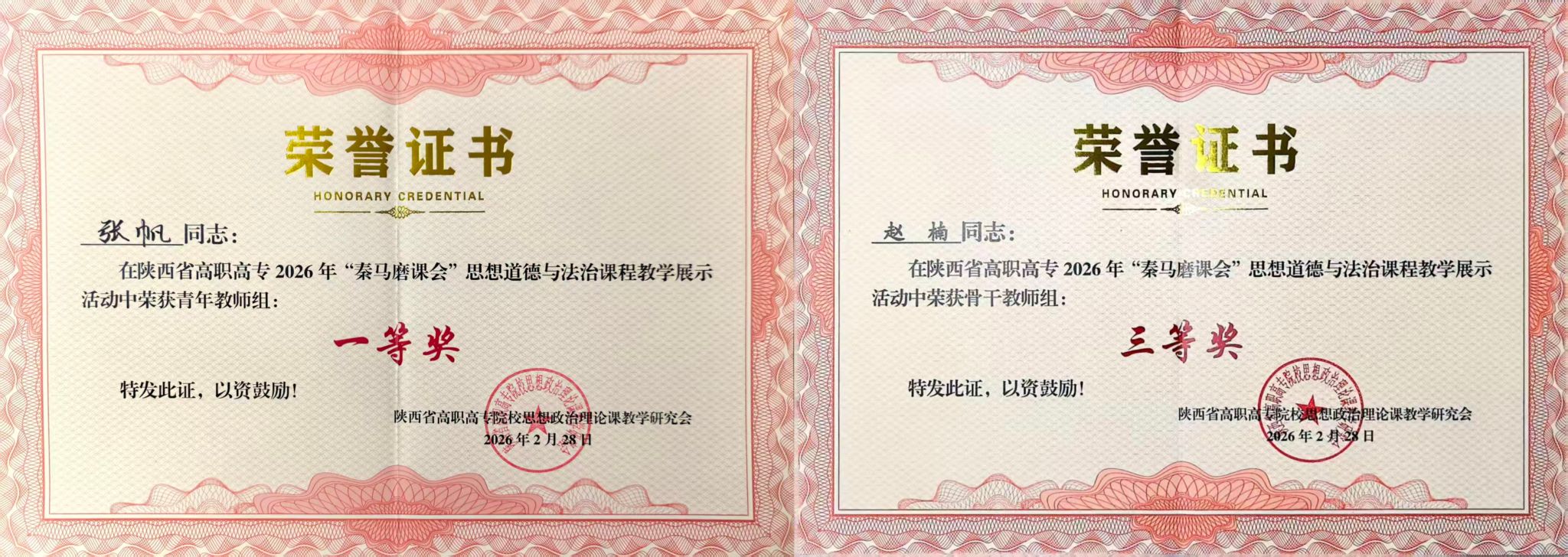 2月28日,陕西省高职高专2026年“秦马磨课会”思想道德与法治课程教学展示活动在陕西职业技术学院圆满落幕。我院马克思主义学院教师凭借扎实的教学功底和出色的现场表现,在众多参赛选手中脱颖而出:张帆老师荣获青年组一等奖,赵楠老师荣获骨干组三等奖,充分展现了我院思政课教师队伍的风采与实力。