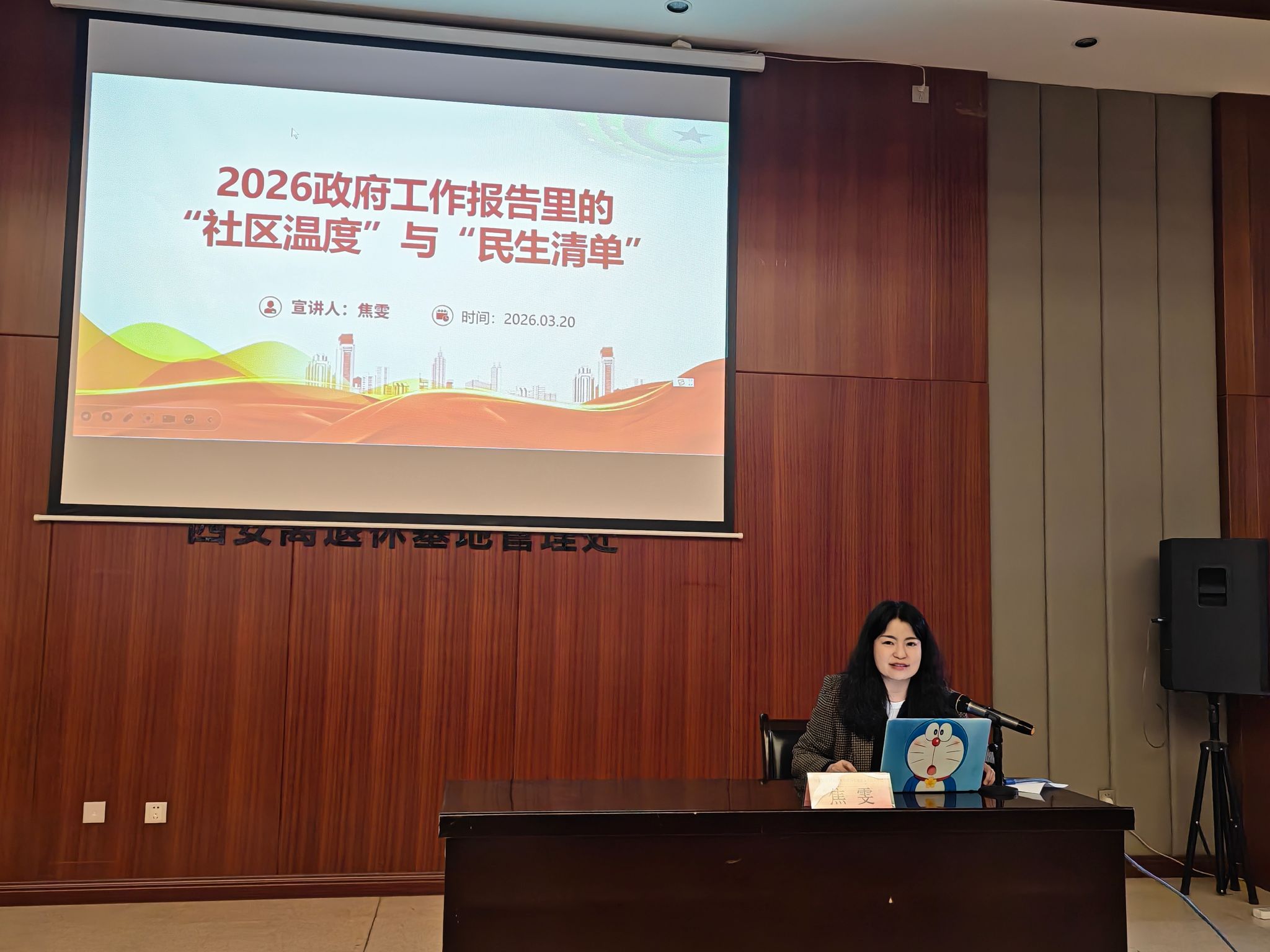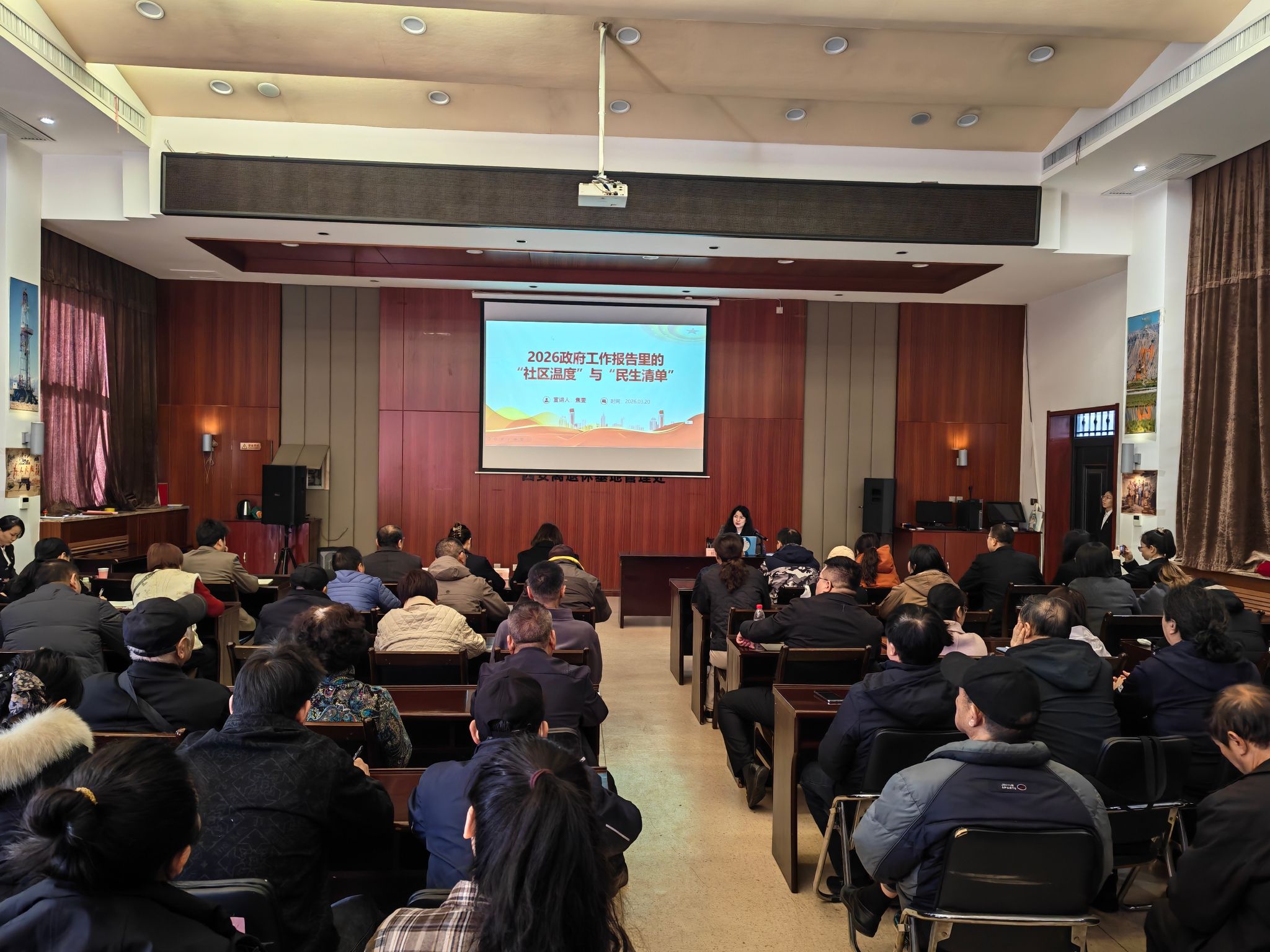 3月20日上午,马克思主义学院教师焦雯在青海石油办大礼堂为韦曲街道航天社区、澜林社区、澜山社区开展了题为《政府工作报告中“社区温度”与“民生清单”》的专题授课。航天社区党委书记罗菲、副书记付丽、澜林社区党委书记朱敏瑞、澜山社区党委书记李博及全体党员共计60余人参加了此次专题授课。